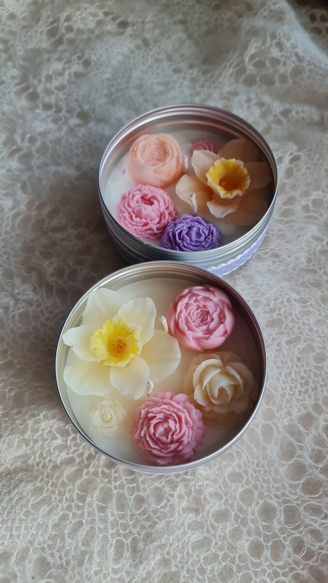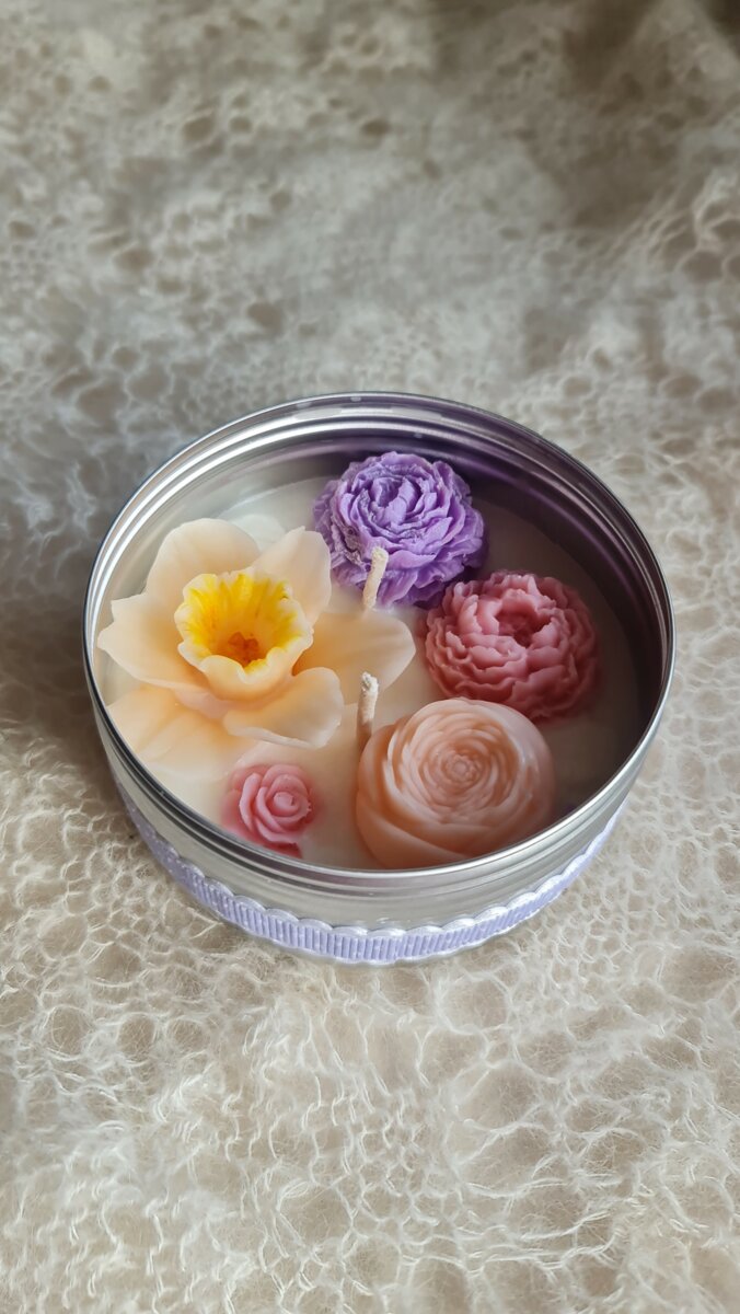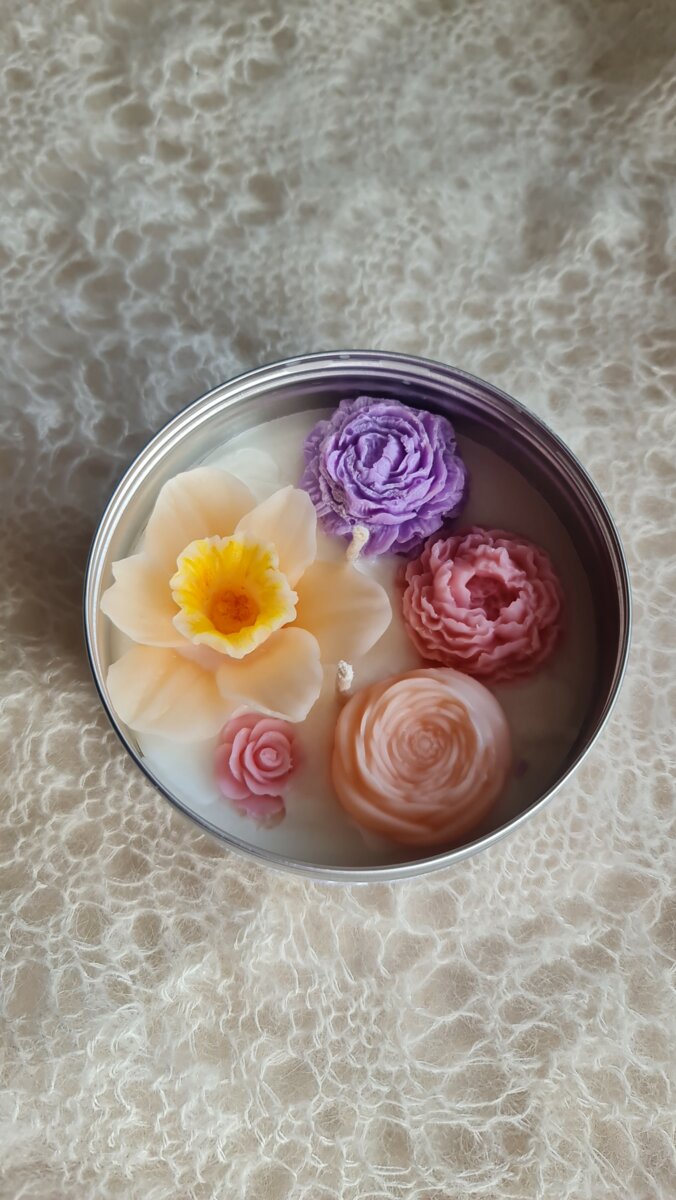 Аромасвіча з соєвого воску, прикрашена квітами нарцису та півонії. Металева баночка, діаметр 9см