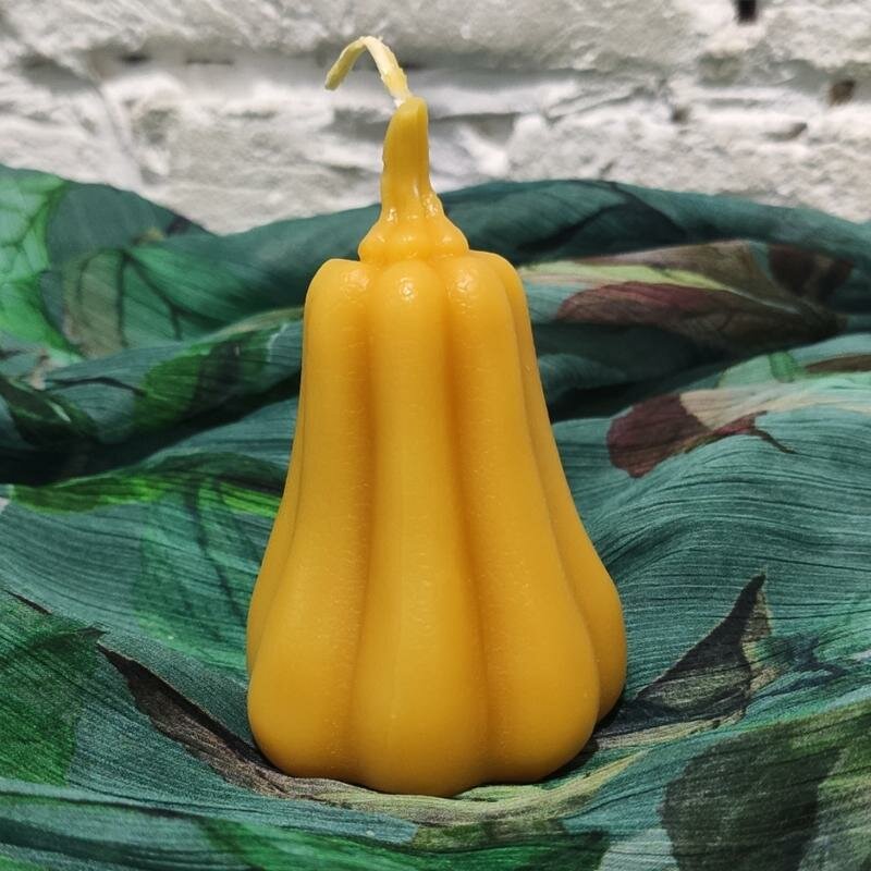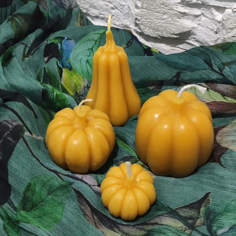 Свічний набір "Гарбузова сім'я" зроблена з натурального бджолиного воску, медовий аромат. Колір натурального воску. У наборчику 4 свічки. Гарбузик 2XL 126 гр 70/60мм Гарбузик ХL 90/55 мм Вага 70 гр Гарбузик L 60/55мм см Вага 60 гр Гарбузик S 30/30мм