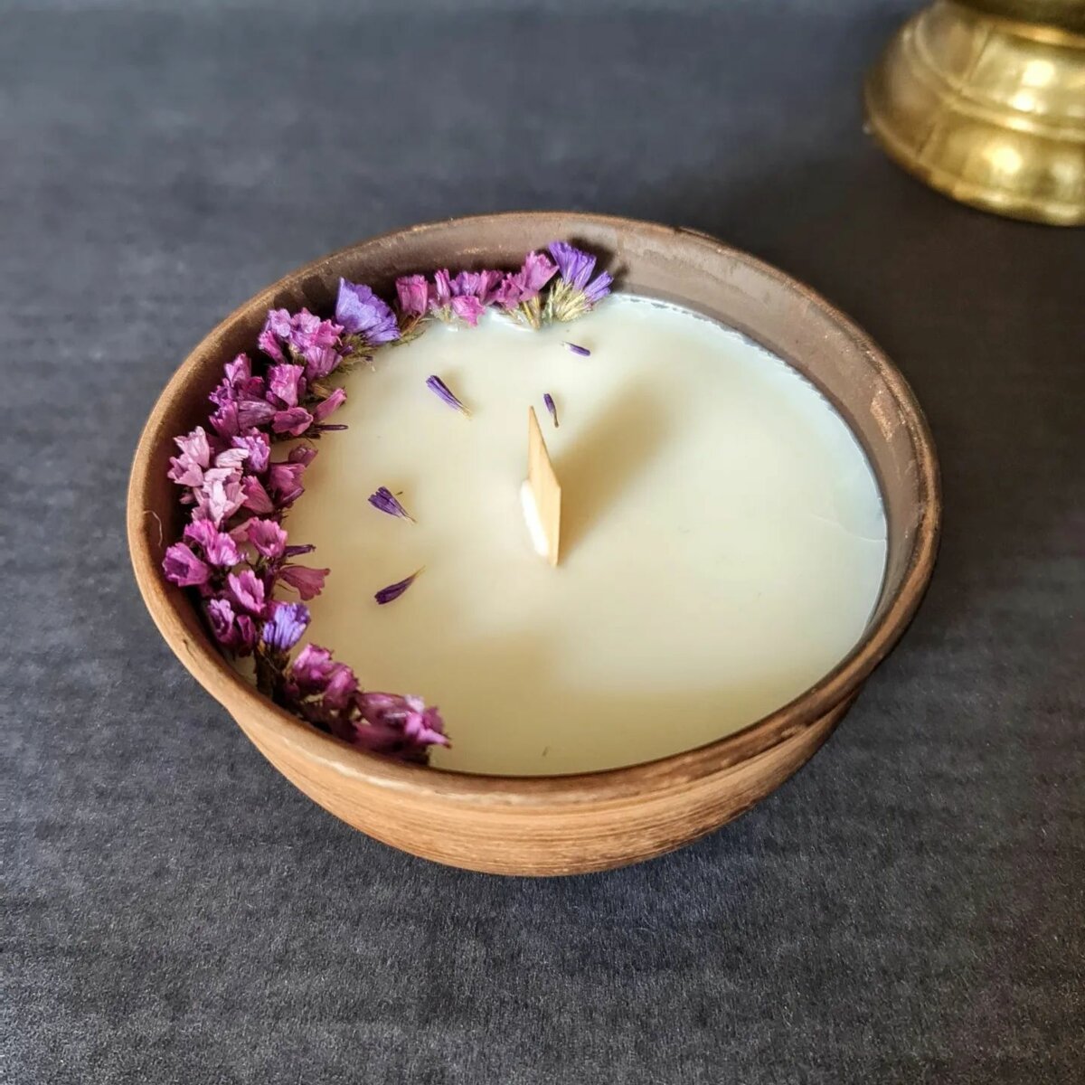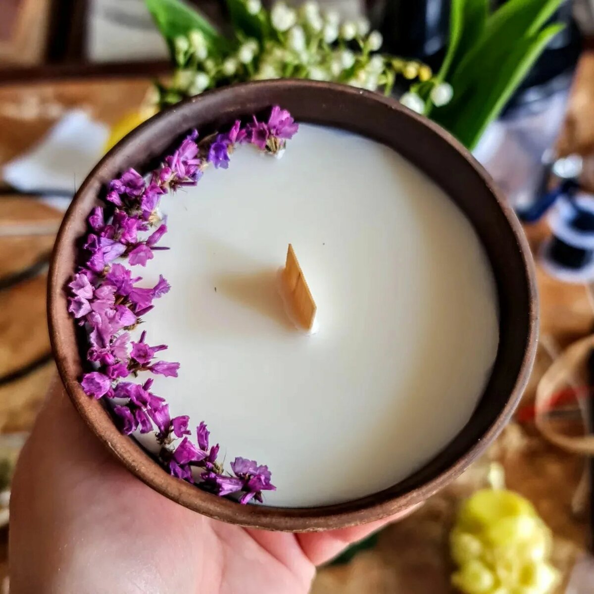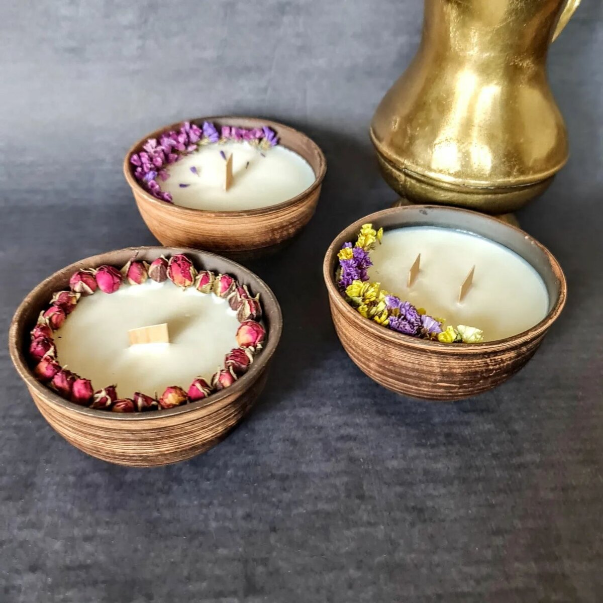 Ароматні свічки ручної роботи, прикрашені квітами у підсвічниках із червоної глини. Рослинний соєвий віск. Аромат півонії.