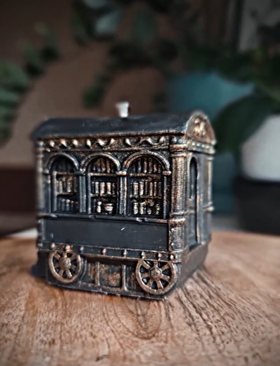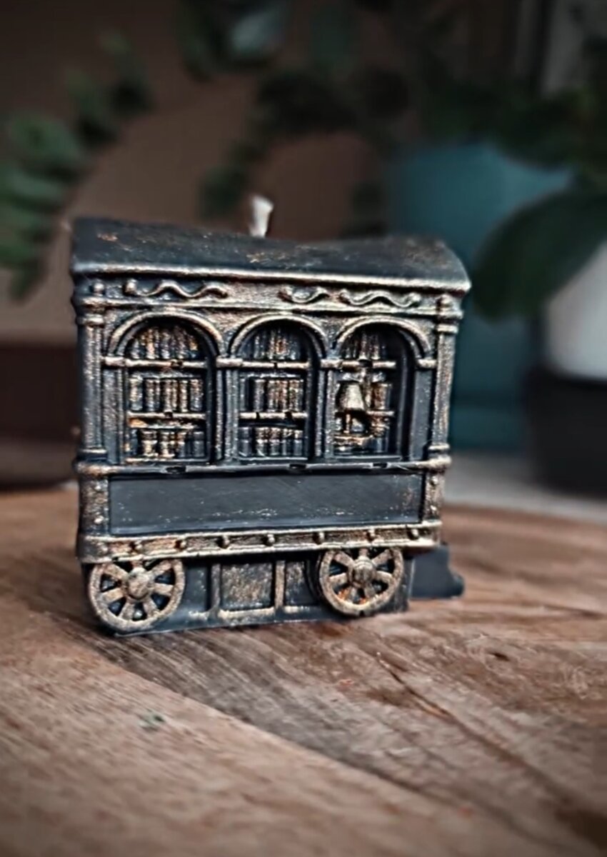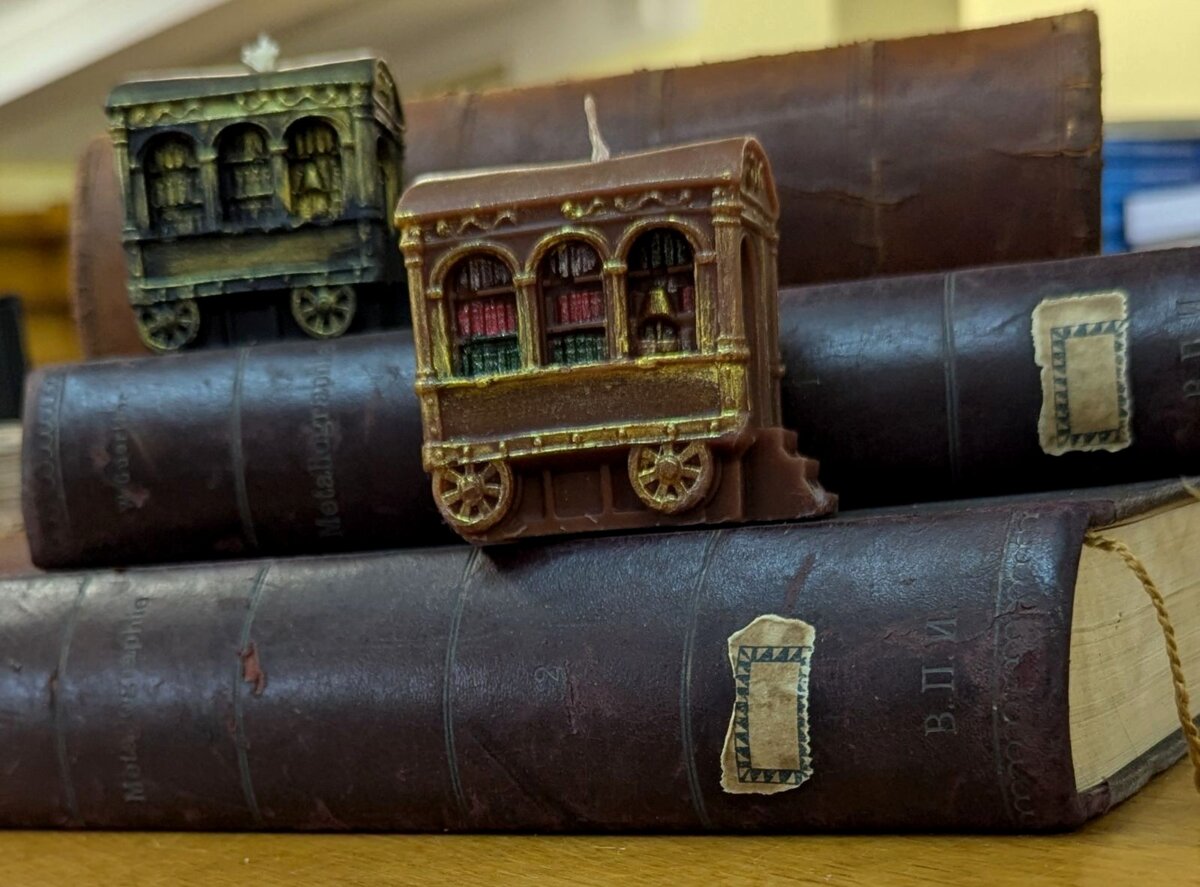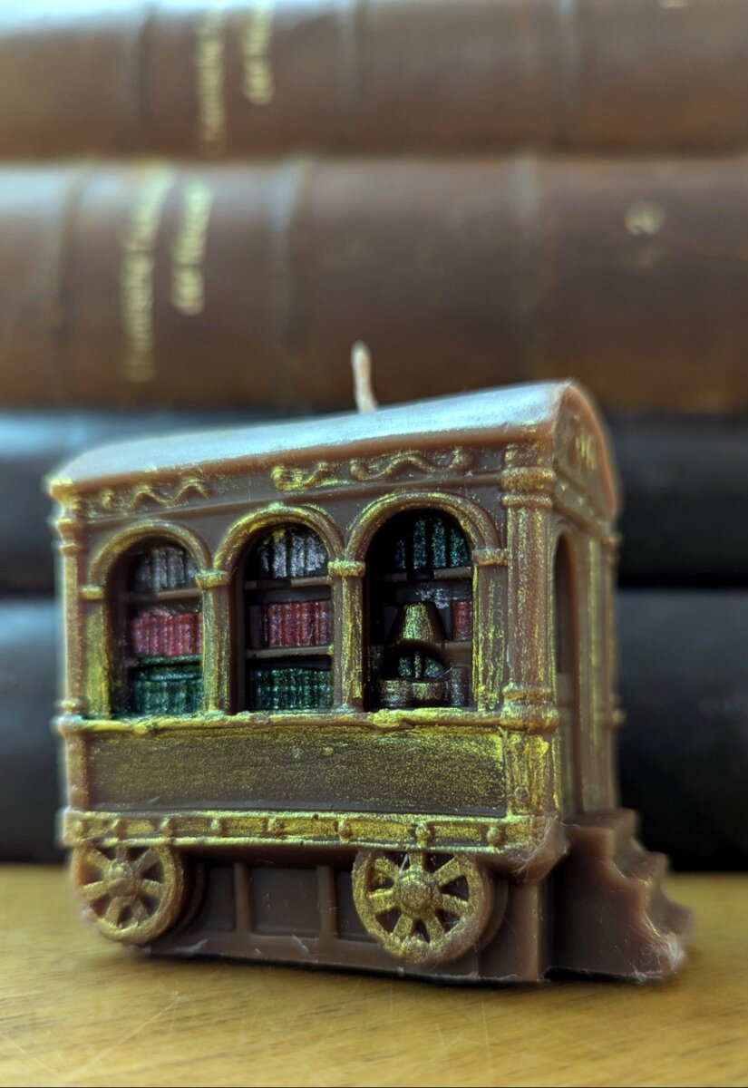 Свічка сувенірна "Вагончик-бібліотека" з бджолиного воску, розфарбована вручну
