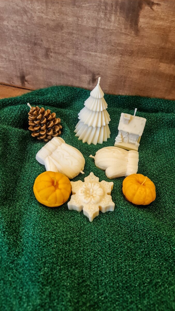 В наборі 8 свічок: 1 ялинка, 2 мандаринки, 2 рукавички, 1 різдвяний будиночок, 1 шишка, 1 сніжинка