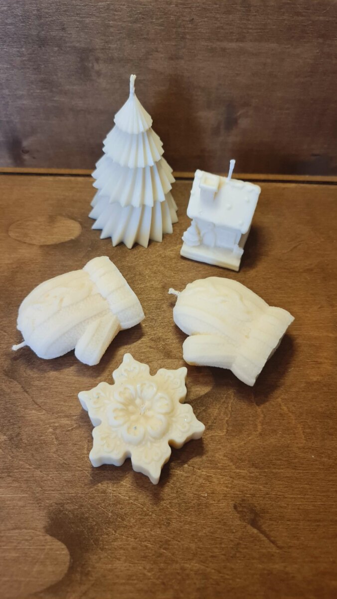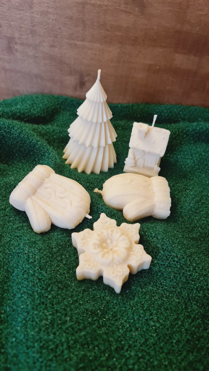 В наборі 5 свічок: 1 ялинка, 2 рукавички, 1 сніжинка 1 різдвяний будиночок. Соєвий віск.