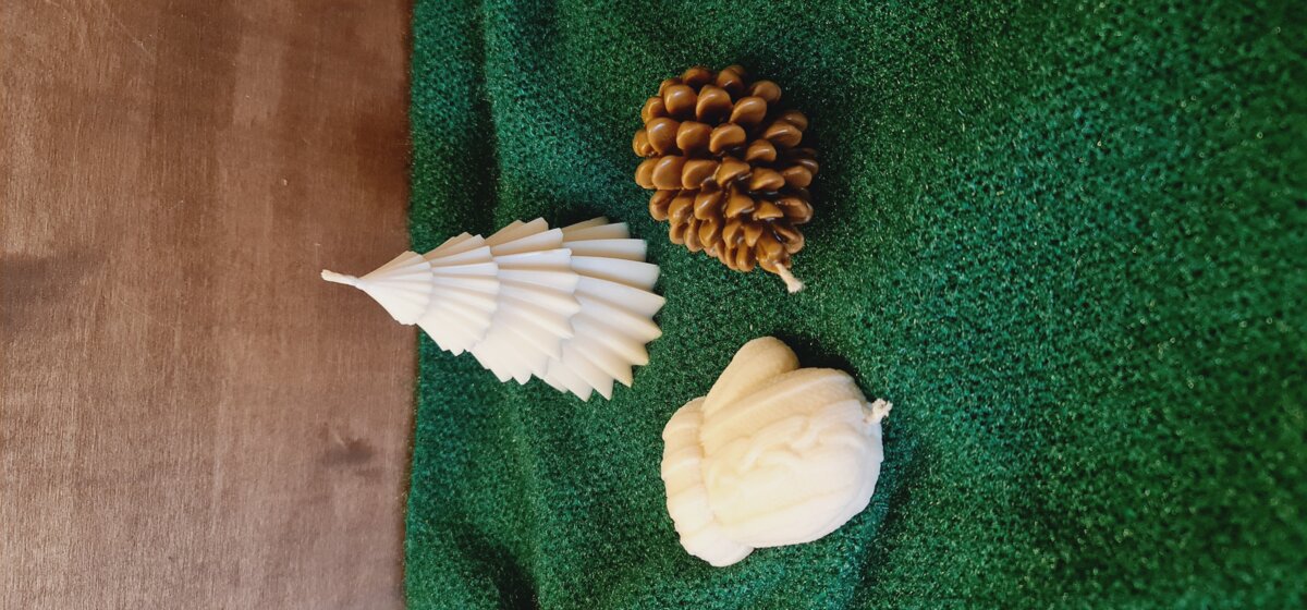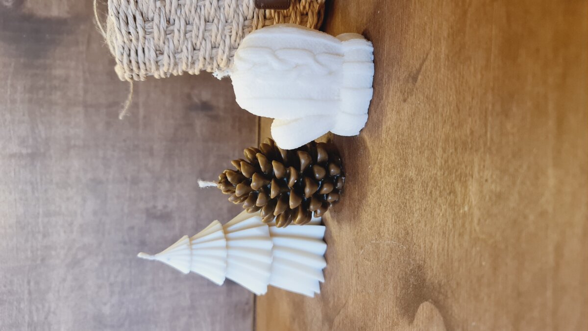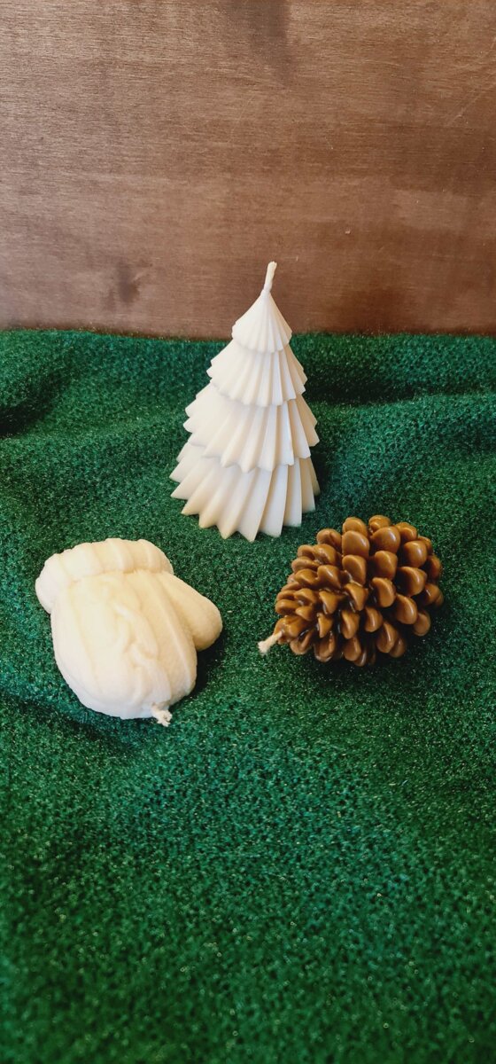 В наборі 3 свічки: 1 ялинка соєвий віск, 1 рукавичка соєвий віск, 1шишка бджолиний віск