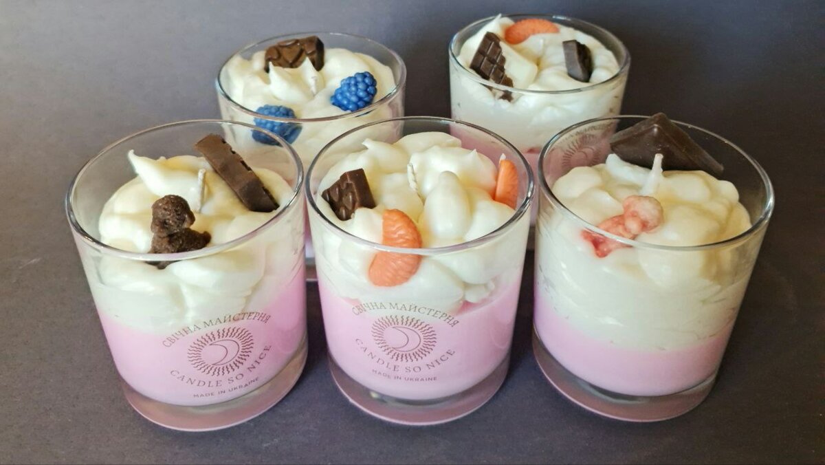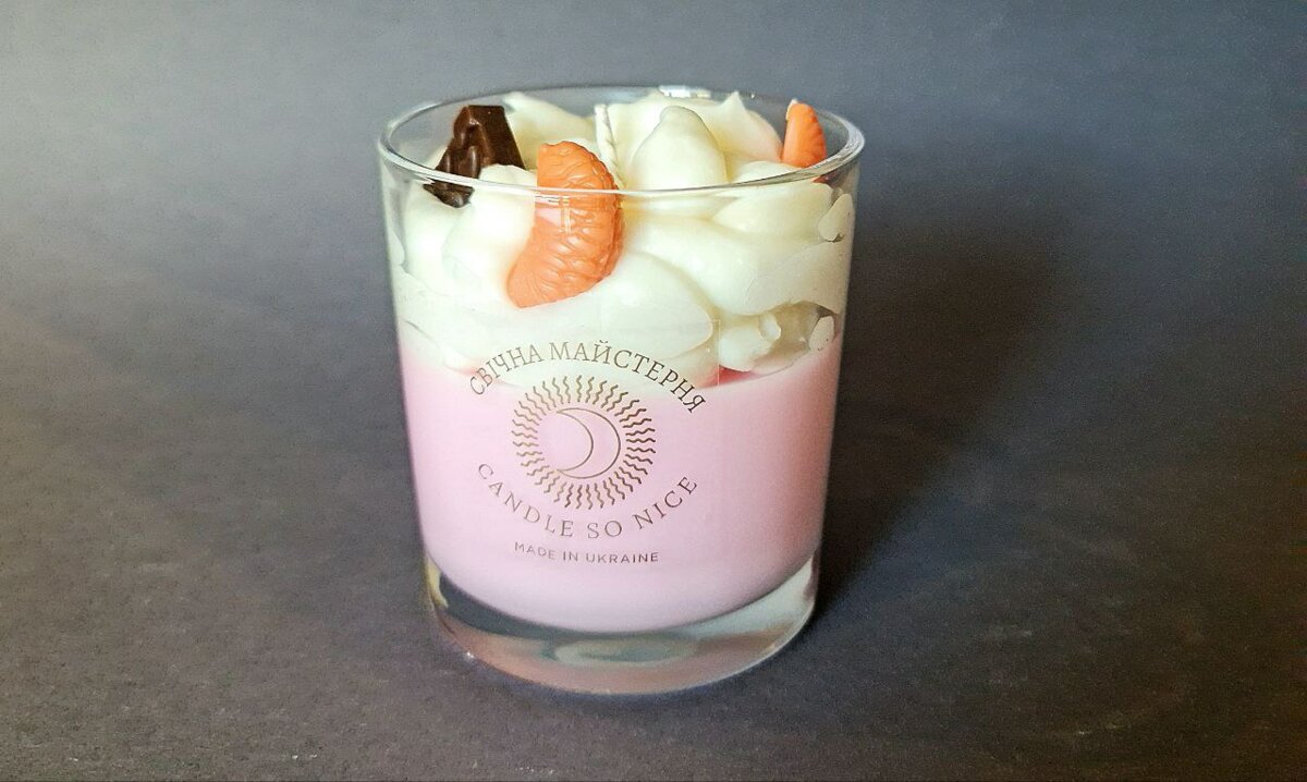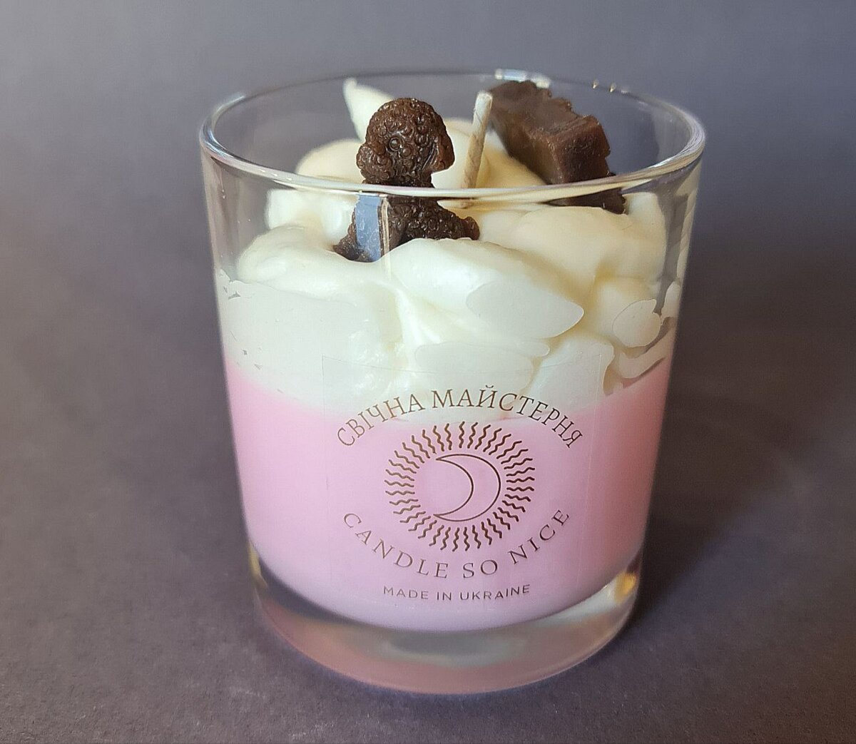 Свіча десерт з соєвого воску прикрашена фігурками мальтипу та шоколаду, з смачним ароматом тірамісу. Обсяг 250 мл, розрахований на 40 годин горіння